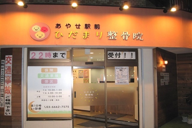 綾瀬駅西口より徒歩1分、受付時間は平日21時まで、交通事故治療・自費治療は平日22時までになります。