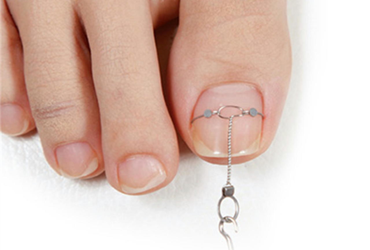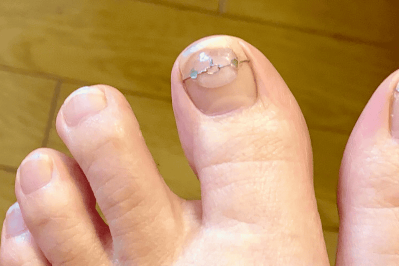 インベントプラスは、爪の両端にワイヤーを引っ掛けて装着し、ワイヤーをねじ上げることで巻き爪を改善していく矯正方法です。